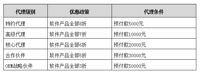 3、代理分为以下级别,代理级别和优惠政策以及代理条件见下表: